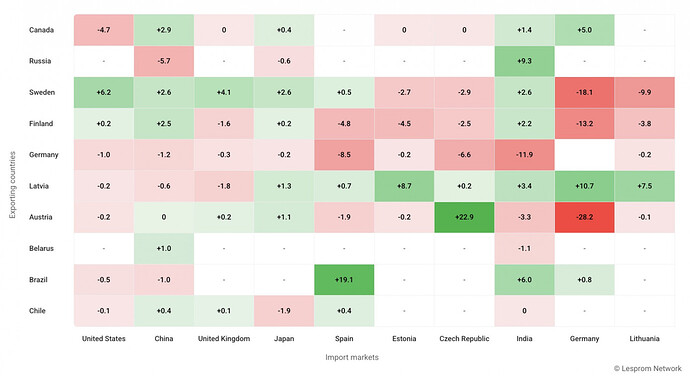 Russia also lost ground in the Chinese market. Its share of China’s softwood lumber imports declined by 5.7 percentage points year on year, while Canada increased its share by 2.9 points and Sweden gained 2.6 points. Finland also expanded its share in China by 2.5 points.