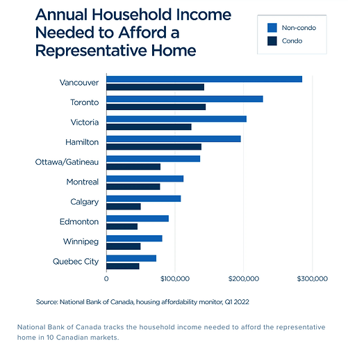 But National Bank’s affordability monitor shows the annual income needed to afford the median or “representative” non-condo home in Toronto rose to $228,100 in the first quarter of the year.