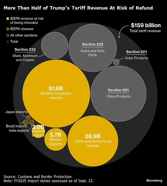 Most of the jump in customs duties — up $95 billion from the year before — is thanks to Trump’s levies on imports from dozens of economies that went into effect in August, according to a Bloomberg Economics analysis. Two lower courts have already ruled Trump was not permitted to impose tariffs under the law he cited: the International Emergency Economic Powers Act.