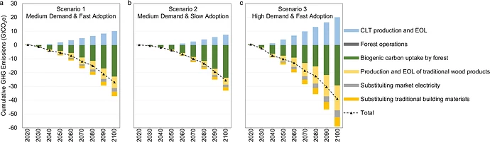 The study found that while the direct emissions from increased cross-laminated timber production (as captured by the life cycle analysis) would rise slightly, by 1.6 to 2.4 GtCO2e by 2100, this increase is more than offset by reductions in avoided cement, steel use and wood waste. “When all factors are considered, total emissions could fall by 1.9 to 9.7 GtCO2e, translating to a net reduction of 7.1 % to 24.7 % in cumulative emissions by century’s end,” they said.