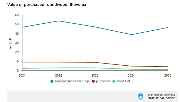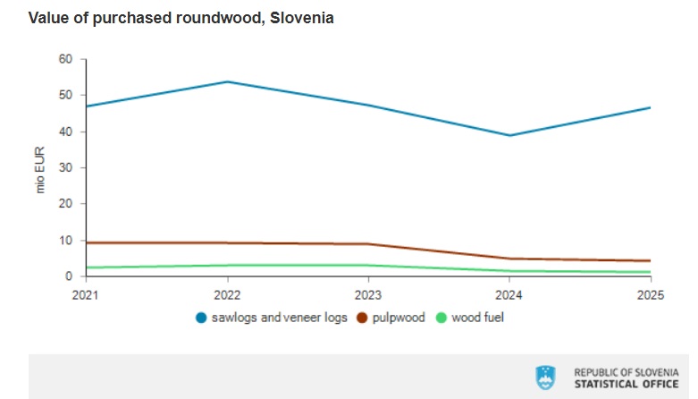 The total value of roundwood purchased from Slovenian private forests increased 13.7% in 2025 compared to the previous year, driven by a one-fifth rise in sawlog and veneer log value. The gains reflected higher quantities and average prices for coniferous logs, while non-coniferous log values declined due to lower purchased volumes, according to the Statistical Office of the Republic of Slovenia.