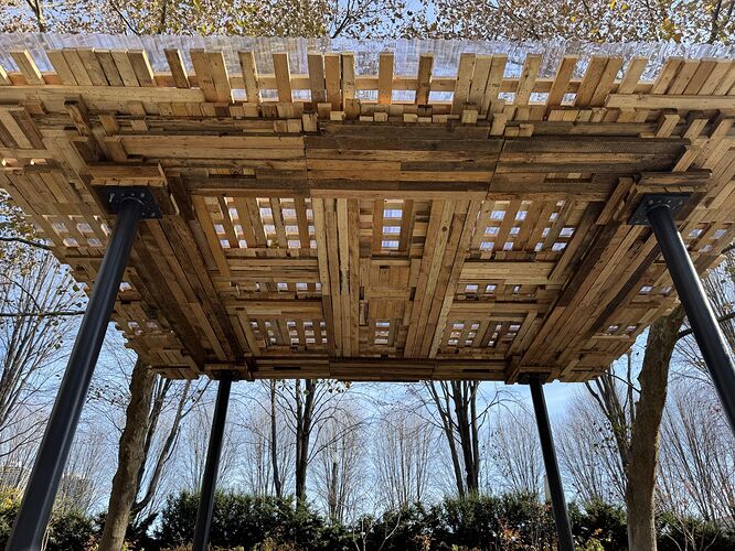 But the benefits, Yin and Henry agreed, are potentially scalable. To create the pavilion, titled “Re-SPLAM (Reclaimed Spatial Laminated Timber),” WashU and SOM forged a series of industry partnerships — with Rebuilding Exchange, Norcon Inc., the Mid-America Carpenters Regional Council and Simpson Strong-Tie, among others. The aim was to demonstrate how material reuse, combined with innovative structural design, can provide an economical, low-carbon alternative to conventional construction.