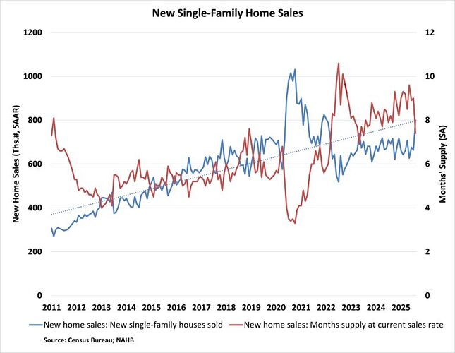 A year ago, there were 104,000 completed, ready-to-occupy homes available for sale (not seasonally adjusted). By the end of August 2025, that number increased 18.3% to 123,000. However, completed, ready-to-occupy inventory remains just 25% of total inventory, while homes under construction account for 53%. The remaining 21% of new homes for sale in August were homes that had not started construction when the sales contract was signed.