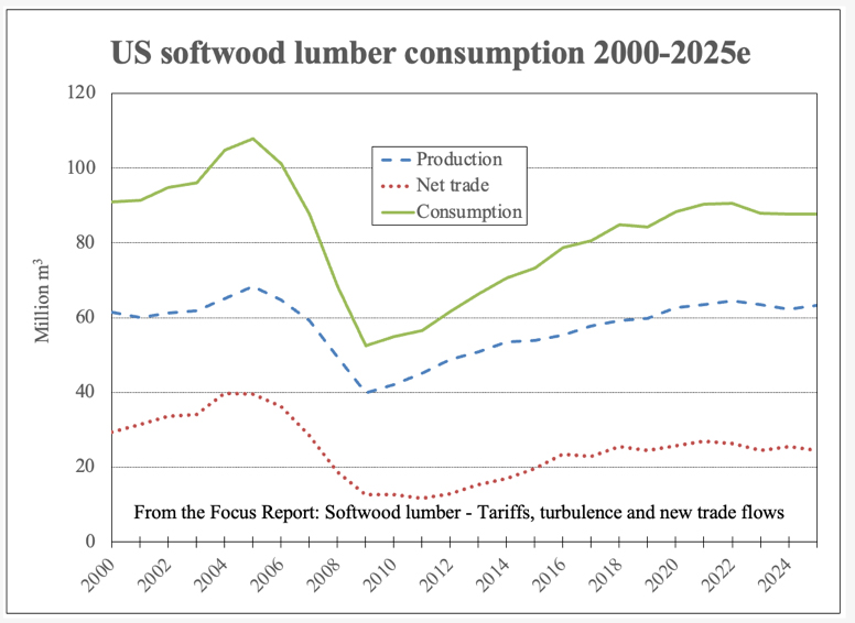 Imports have long been critical to the US wood supply. Over the past fifty years, imported lumber has consistently provided 25β33% of total US consumption. Canada remains the dominant source, supplying about 80% of US imports over the last decade and projected to supply more than 22% of total US consumption in 2025, according to the new market report Softwood Lumber β Tariffs, Turbulence and New Trade Flows to 2030. When European shipments are included, nearly 30% of US lumber needs will be filled by foreign producers.
